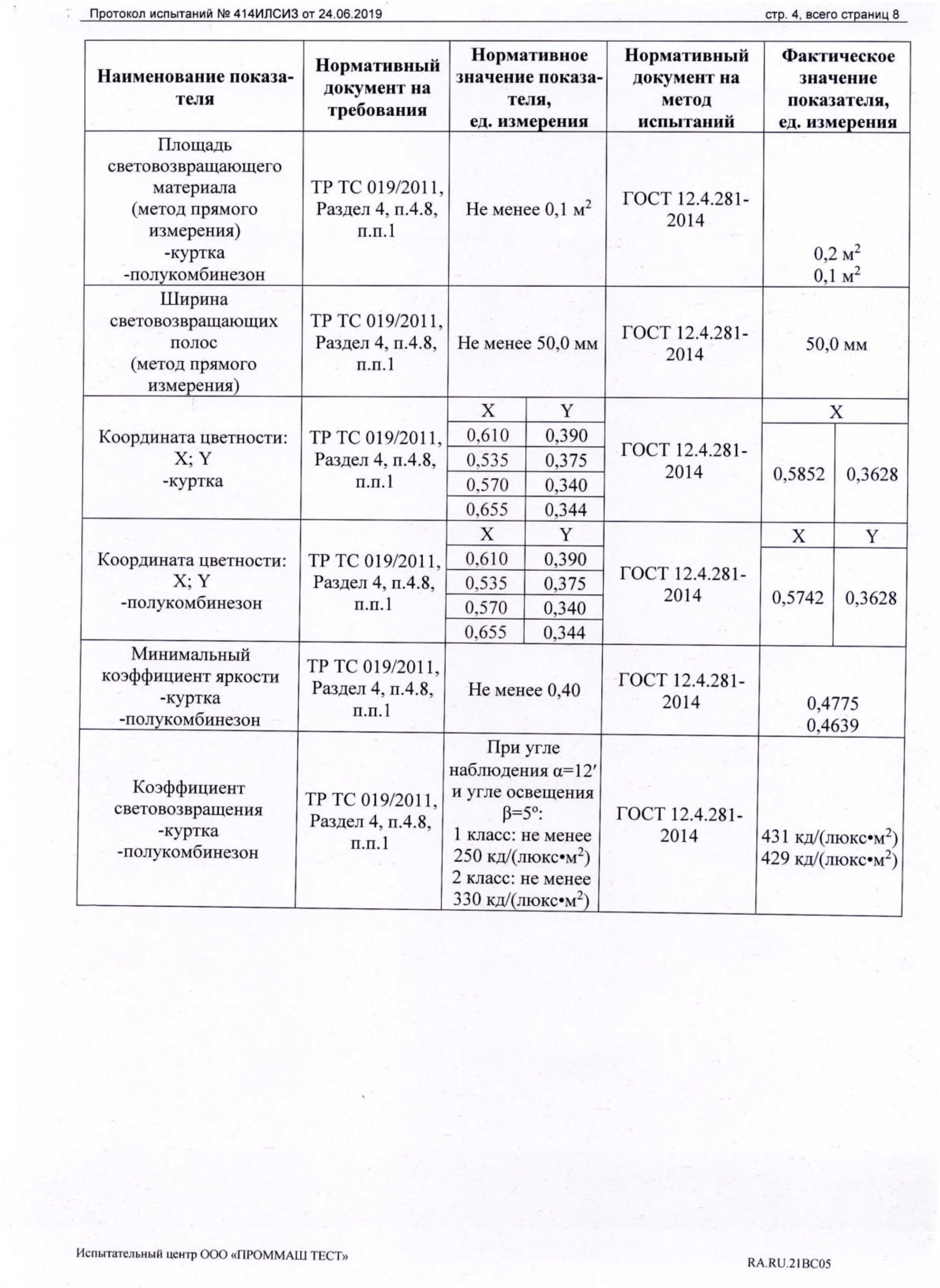 По низу полукомбинезона проложены 2 световозвращающие полосы шириной 50 мм с коэффициентом отражения 400 кд/м2.