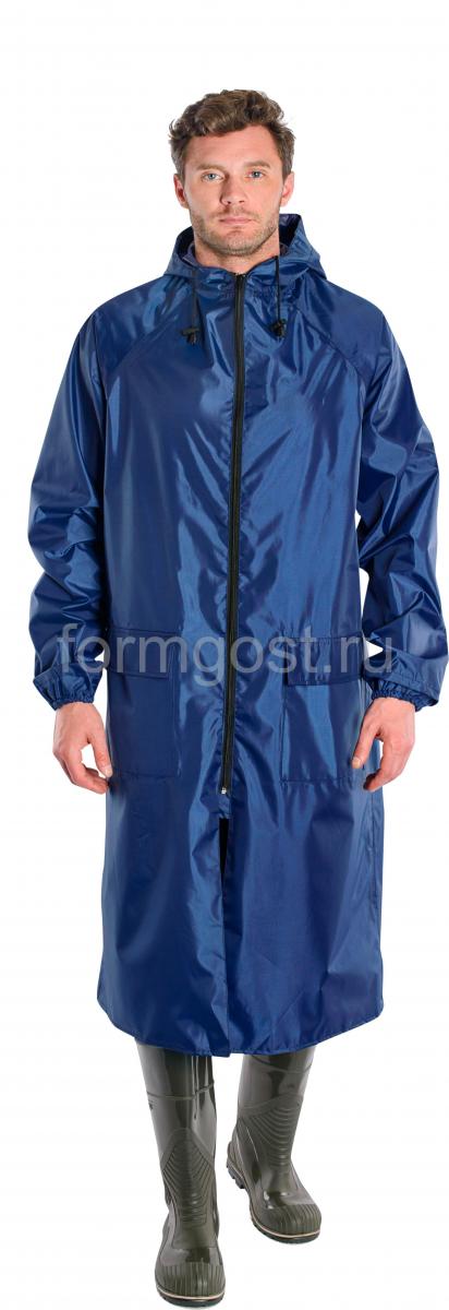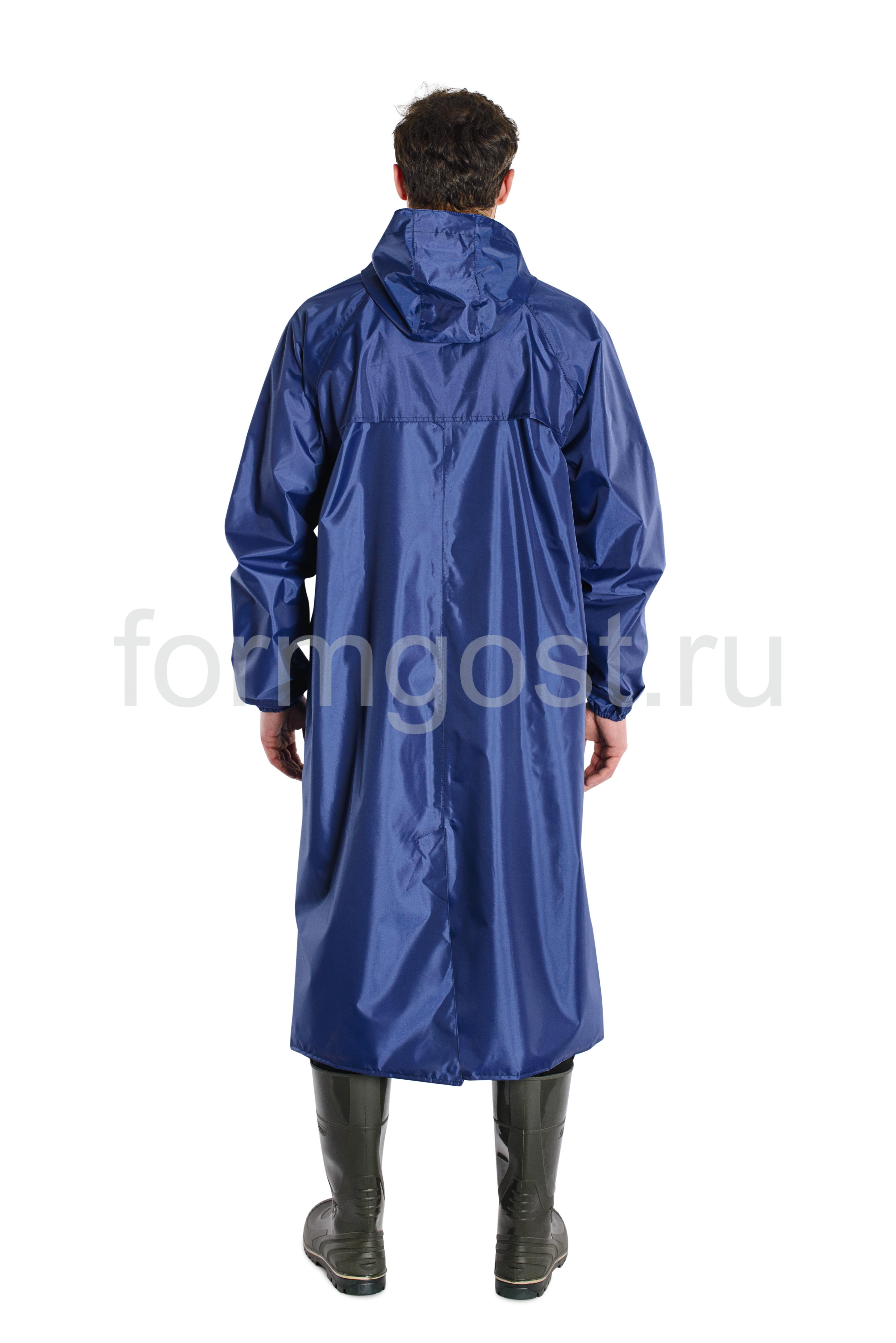 Плащ с застежкой на молнии, клапаном против ветра, капюшоном и двумя карманами с клапанами. Ткань: плащевая с ПВХ покрытием (225 г/м2) Размеры: с 48-50 по 60-62 ГОСТ Р 12.4.219-99