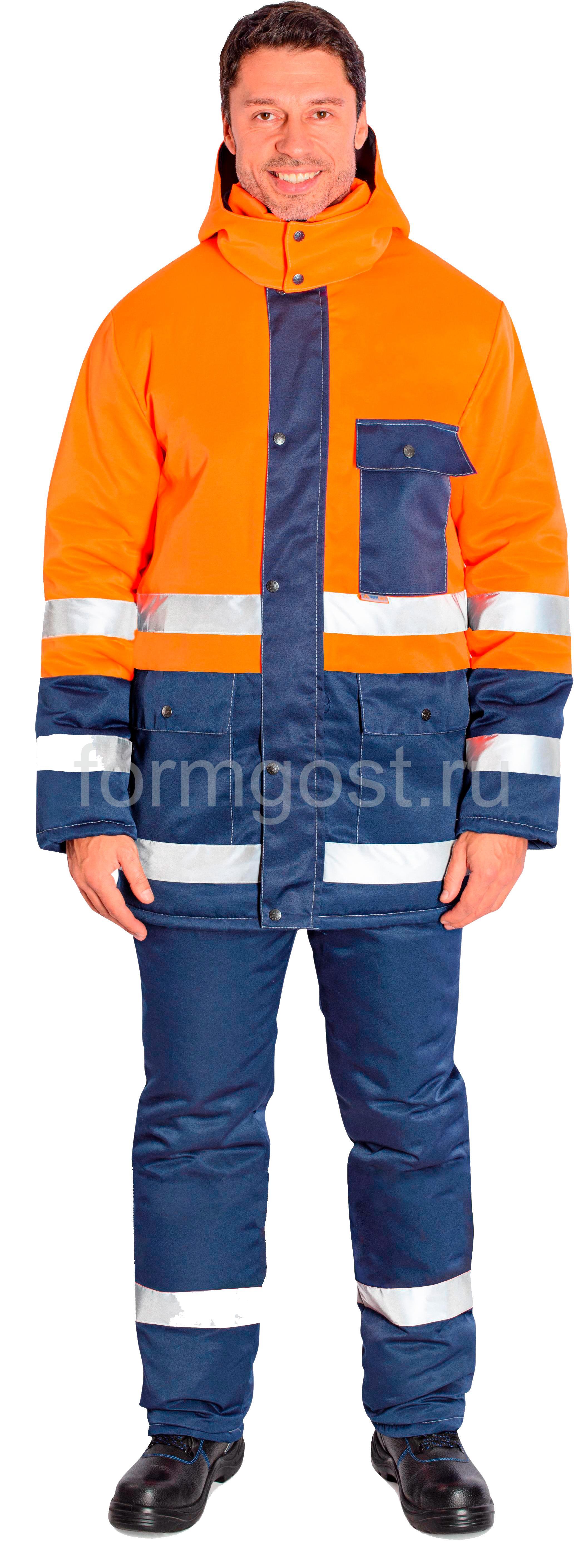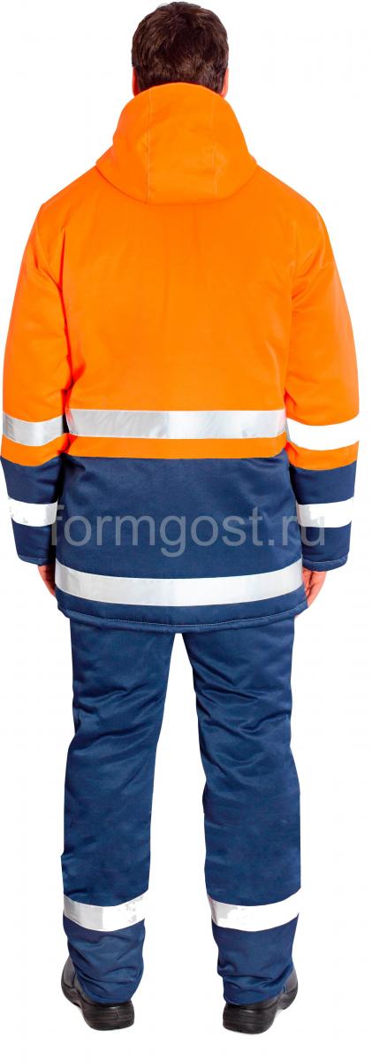 Куртка утепленная застегивается на молнию и ветрозащитную планку на кнопках. Имеет отстегивающийся утепленный капюшон и воротник - стойку. По линии талии регулируется кулисой. Рукава одношовные, комфортного покроя, внизу рукавов вшитые изнутри трикотажные манжеты. Куртка имеет три наружных накладных кармана, два внизу куртки и один на груди. На куртку нашиты качественные световозвращающие полосы с высоким коэффициентом отражения.