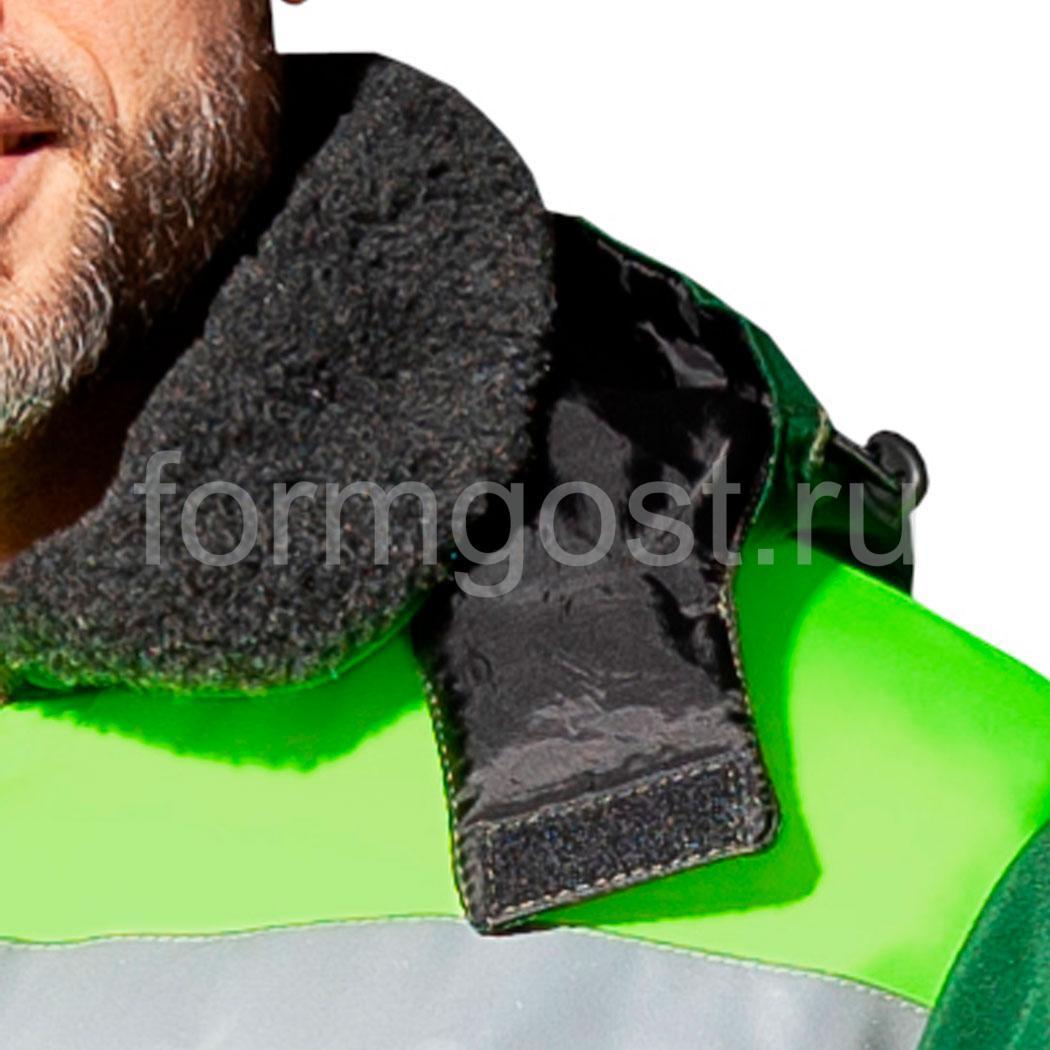 Куртка рабочая Труд-М с супатной застежкой на пуговицы, с плотным меховым воротником, отстегивающимся утепленным капюшоном с "затяжниками", защищающими от ветра.