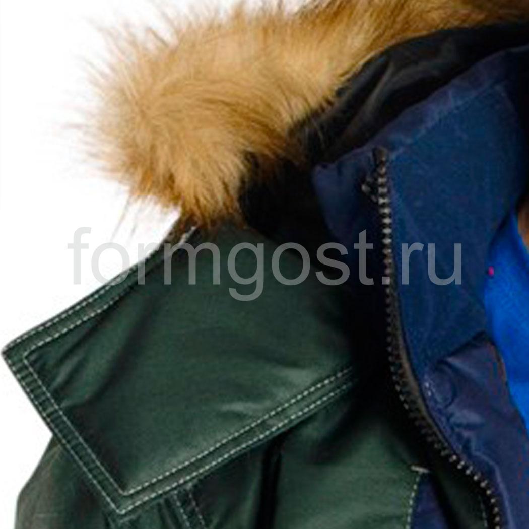 Воротник-стойка утеплен «флисом». Капюшон отстёгивается и фиксируется на кнопки. По лицевой части капюшона меховая опушка из искусственного меха «енот», для защиты лица от ветра. Также размер капюшона регулируется затяжником на затылочной части и эластичным шнуром с фиксаторами по лицевой части.