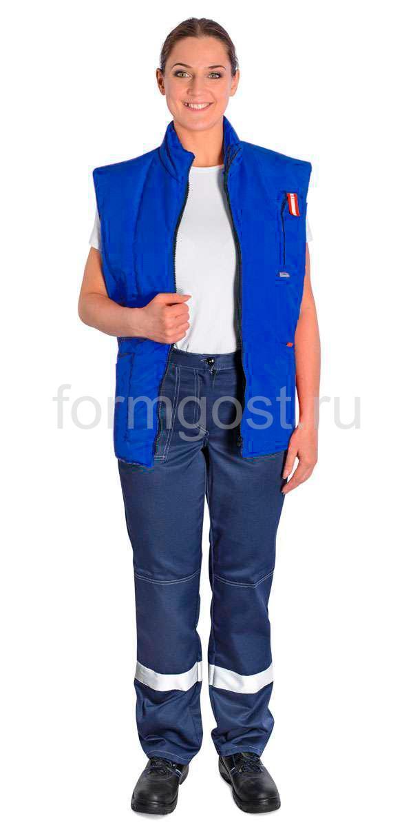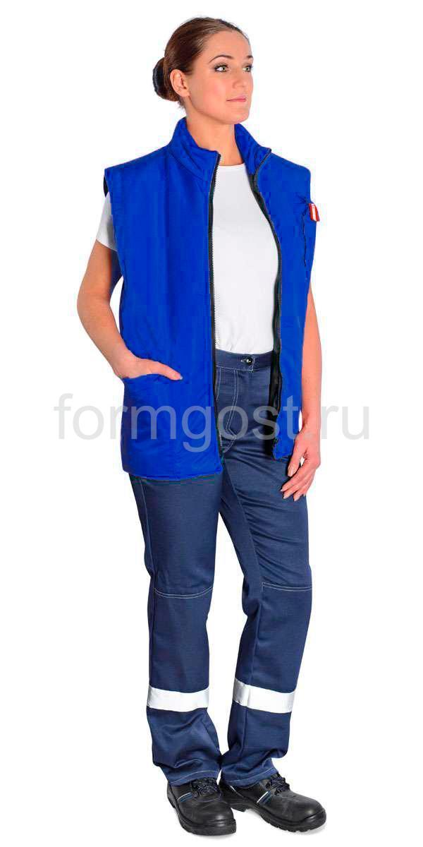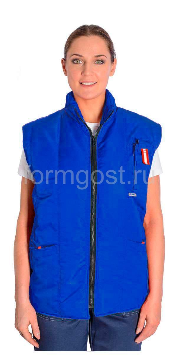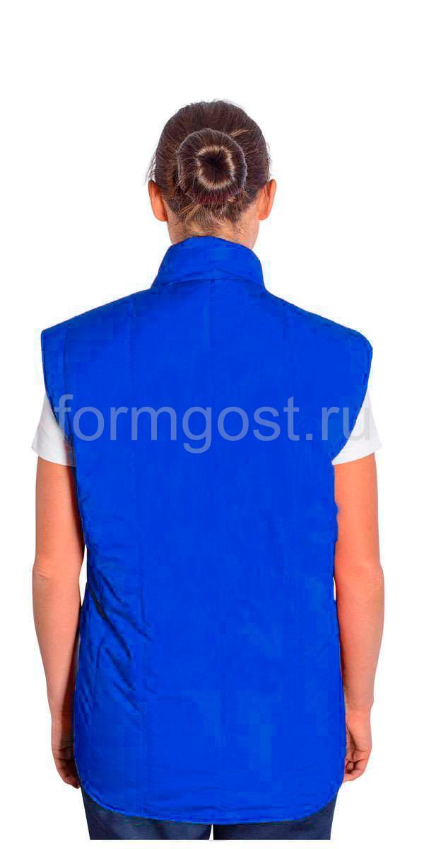 Жилет с удлиненной спинкой, с центральной застежкой на молнию "трактор", с накладными карманами внизу, застегивающимися на потайную кнопку, и с верхним карманом на "липучке".