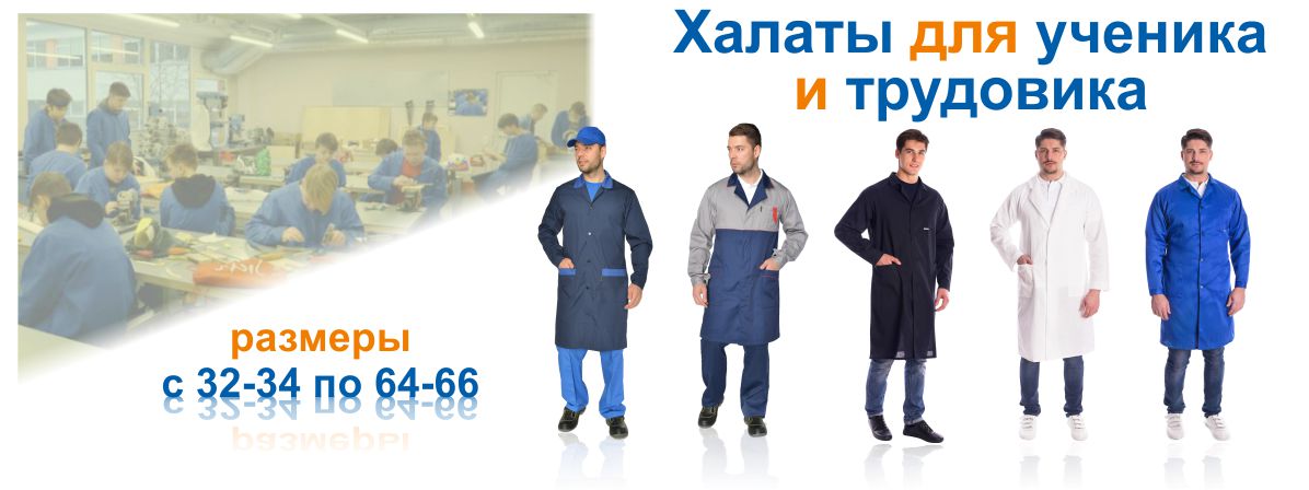 Рабочие халаты для уроков труда в школе или производственной практики в технических учебных заведениях. Для мальчиков и девочек – различные модели и цвета. Кроме того, в наличие есть женские фартуки.